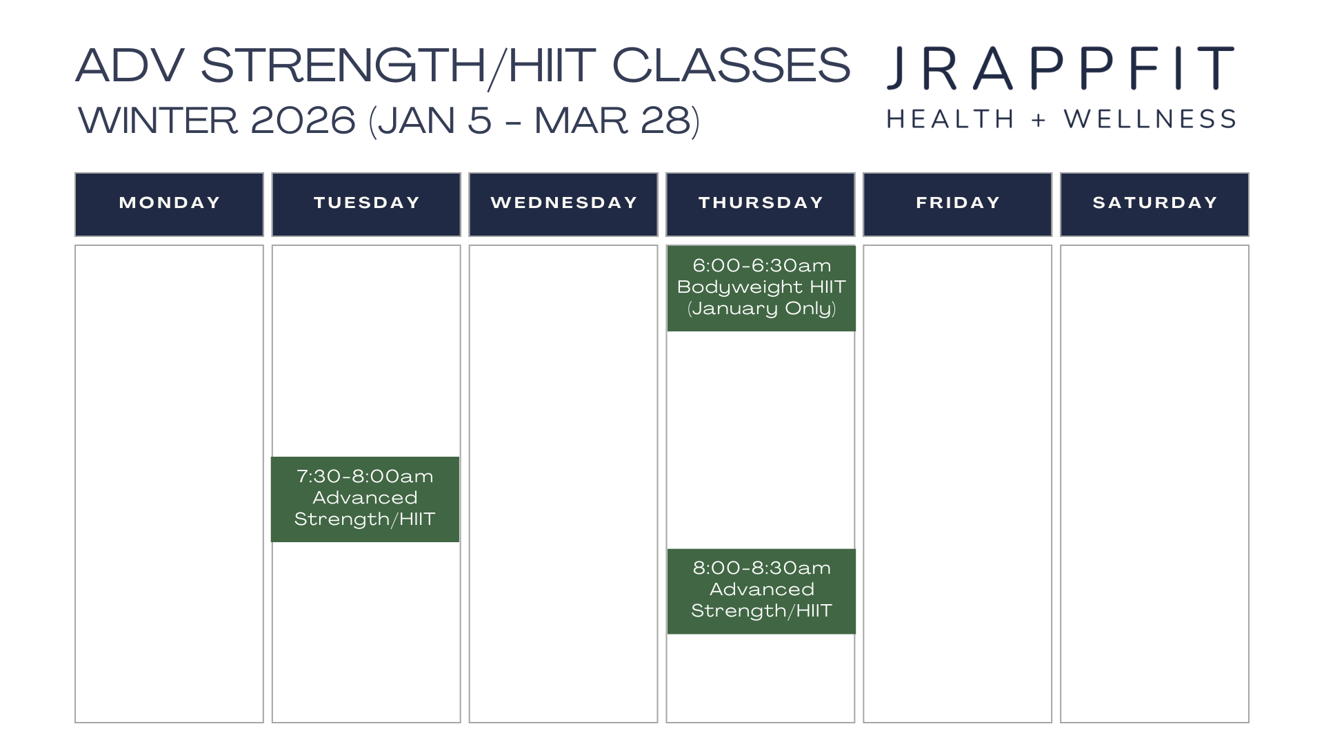 Thursdays - Adv Strength/HIIT, 8:00-8:30am et.